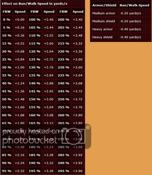 Example: If your goal is 150frw/3.0 yards/sec and you are wearing a shaftshop mesh armor (medium armor) then you actually need a total of 175%frw from gear/charms to stay at 3.0yards/sec. Follow this chart for your specific build.