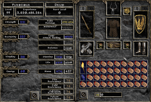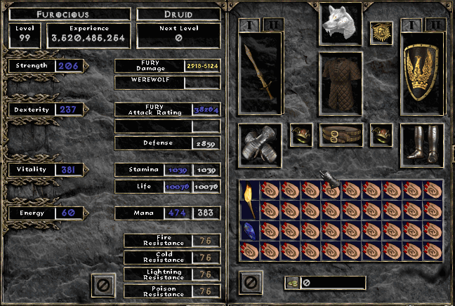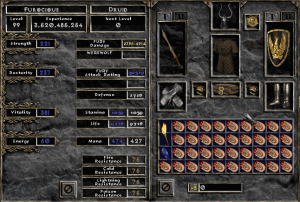 My home is LoD Druid Grove USEast-1, but I played West for a few years and have also had a small presence on Europe. I started back in 2002, so I’ve also played through the various game mechanics changes from 1.08 through the current patch. At one point, I used to receive literally dozens of messages a week asking for build advice, and I still get at least one or two per week. So, after all these years, I’m releasing a short guide on the best builds for PvP/melee vs. melee oriented fury wolves. In the future, I may add information on Fury vs. All/Public duel strategies, but this guide will be centered specifically on dueling other fury wolves, zealers, concentrate barbarians, jabbers, and other melee class characters.